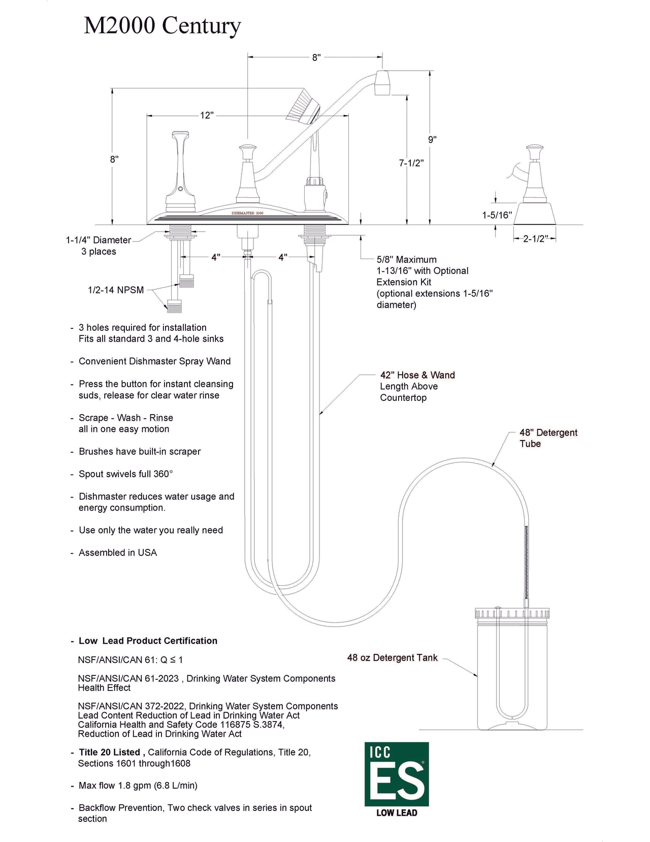 - Classic and timeless to suit any style kitchen, the M2000 Century features a high clearance spout and a generous 48-ounce detergent reservoir conveniently located beneath the sink. Three brushes are included.