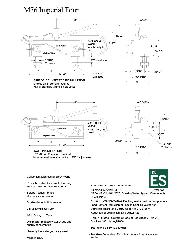 - Sink or countertop installation requires two holes on 8" centers and fits all standard 3-hole and 4-hole sinks.